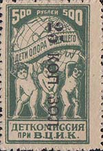 1924 г.  Второй вспомогательный выпуск. Черная типографская надпечатки нового номинала на марках первого всесоюзного выпуска Деткомиссии при ВЦИК.