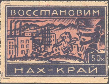 1931 г.  Всероссийский сбор. Разм. рамки 39 х 24 мм. Одноцветная и двухцветная печать на кремовой (оттенки) бумаге. Нерегулярная зубц. В двойной прямоугольной рамке в центре разрушенный землетрясением город. Справа силуэт человека со знаменем с серпом и молотом и номинал в прямоугольной рамке. Сверху текст: «Восстановим». Внизу продолжение текста: «Нах-край».