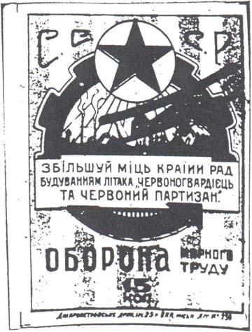 В центре в круглой рамке в виде шестерни самолет-биплан, летящий вправо над городом. Выше в круглой рамке пятиконечная звезда. Сверху аббревиатура «С.С.С.Р.». Ниже в прямоугольной декоративной рамке текст в три строки на украинском языке: «Увеличивай мощь Страны Советов постройкой самолета «Красногвардеец и Красный партизан». Ниже текст в две строки на украинском языке: «Оборона мирного труда».