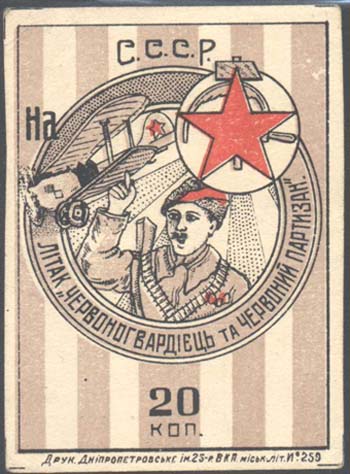 В центре в двойной круглой рамке партизан, над ним самолет-биплан и красная звезда на фоне серпа и молота в круглой рамке. По периметру между рамками текст на украинском языке: «На самолет «Красногвардеец и Красный партизан». Сверху аббревиатура «С.С.С.Р.».