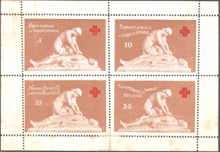 1916 г. Разм. 54 х 34 мм. Двухцветная печать на плотной желтоватой бумаге со сплошным цветным фоном различных цветов. Зубц. 11 1/2. В центре аллегорический сюжет. В правом верхнем углу красный крест. Слева сверху текст в две строки на финском языке: «В пользу больных и раненых воинов» и номинал.