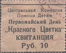 1923(?) г. Разм. по перфорации 39 х 31 мм. Одноцветная печать на тонкой бумаге различных цветов. Зубц. 11 1/2. Сверху текст в две строки: «Центральная Комиссия Помощи Детям». В центре текст три строки: «Первомайский День «Красного цветка» Квитанция Руб. ...». На лицевой стороне фрагмент оттиска круглой печати фиолетового цвета.