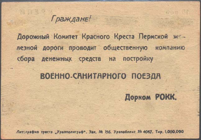 1931 г. Листок разм. 106 х 75 мм. Трехцветная двухсторонняя печать на желтоватой бумаге. На лицевой стороне в центре санитарный поезд и три санитарных самолета. В правом верхнем углу текст в четыре строки: «Крепи военно-санитарную оборону СССР». В левом верхнем углу номинал. Внизу в центре красный крест и аббревиатура «РОКК». Слева внизу текст в три строки: «Построим военно-санитарный поезд». Справа внизу текст в три строки: «Дорожный комитет Красного Креста Пермской жел[езной]. дор[оги].». На оборотной стороне текст в шесть строк: «Граждане! Дорожный Комитет Красного Креста Пермской железной дороги проводит общественную компанию сбора денежных средств на постройку Военно-санитарного поезда». Дорком РОКК». Внизу выходные данные мелким шрифтом: «Литография треста «Уралполиграф». Зак. №156. Уралоблит №4057. Тир. 1.000.000».