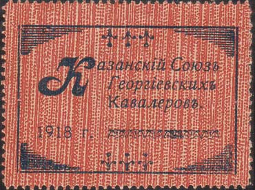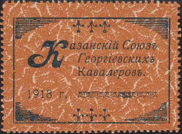 1918 г. 15.04.1918 г.  Разм. рамки 33 х 54 мм. Зубц. 10. Одноцветная печать на бумаге различных цветов. В декоративной рамке в центре герб Казани. Сверху текст в три строки: «Союз Георгиевских Кавалеров». Внизу дата в две строки: «1918 15 апр[еля].». (O).