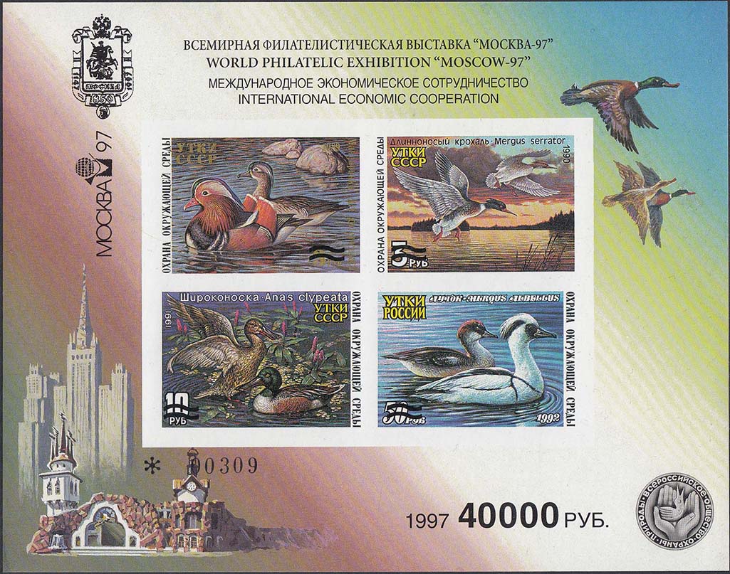 1997 г. Листок разм. 172 х 137 мм. Многоцветная печать на белой мелованной бумаге. В центре четыре марки предыдущих выпусков. Номиналы марок забиты волнистыми линиями. На полях листов различные виды Москвы. Слева логотип филвыстваки «Москва 97». Сверху текст в две строки на русском и английском языках: «Всемирная филателистическая выставка «Москва» 97. Международное экономическое сотрудничество». Внизу номинал и дата: «1997» и логотип ВООП.