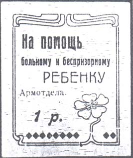 1923 г. Разм. 45 х 54 мм. Одноцветная печать на желтоватой бумаге. В декоративной рамке с растительным орнаментом разм. 31 х 45 мм сверху текст в четыре строки: «На помощь больному и беспризорному ребенку Армотдела». Внизу номинал и орнамент из ромбиков.