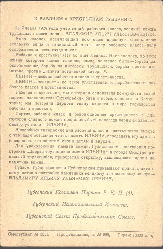 1924 г. Листок разм. 90 х 131 мм. Одноцветная двух-сторонняя печать на толстой кремовой бумаге. На лицевой стороне в двойной прямоугольной рамке разм. 80 х 121 мм сверху на фоне здания с колоннами очередь из людей с кирпичами. В левом верхнем углу на фоне знамени в двойной круглой рамке диаметром 21 мм портрет В.И. Ленина. Сверху облака и лучи солнца. Внизу в отдельной прямоугольной рамке Текст в четыре строки: «Кирпич на постройку памятника В.И.Ленину в Смоленске». Внизу серп и молот. В правом нижнем углу в овальной рамке номинал. Внизу под рамкой мелким шрифтом: «Смоленск, А.Кажура. Типо-Литография им. Смирнова». На оборотной стороне в тридцать три строки текст обращения к рабочим и крестьянам Смоленской губернии Губернского Комитета Партии Р.К.П.(б), Губернского Исполнительного Комитета и Губернского Совета Профессиональных Союзов. Внизу под горизонтальной чертой мелким шрифтом выходные данные: «Смолгублит №3881. Профтехшкола, з. № 885, Тираж 18000 экз.».