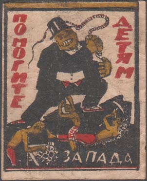 1923 г. Трехцветная печать низкого качества на кремовой бумаге. В прямоугольной рамке в центре аллегорические рисунки. По внутреннему периметру рамки текст: «Помогите детям запада!».