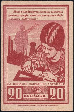 1932 г. Двухцветная печать на сероватой бумаге с мелованным верхним слоем. В тройной прямоугольной рамке различные рисунки. Текст на украинском языке: «В пользу обучения взрослых». Внизу под рамкой мелким шрифтом неразборчиво выходные данные.