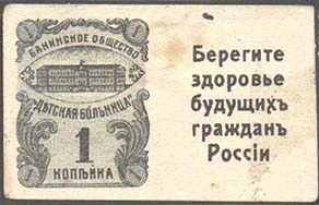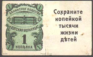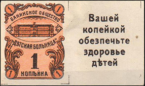 1914(?) г. Разм. 49 х 30 мм. Двухцветная печать на сероватой бумаге. Слева вид больницы. По углам номинал в кружках. Текст: «Бакинское общество «Детская больница»». Ниже номинал: «1 копейка». На купоне слева различные тексты.