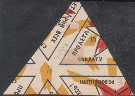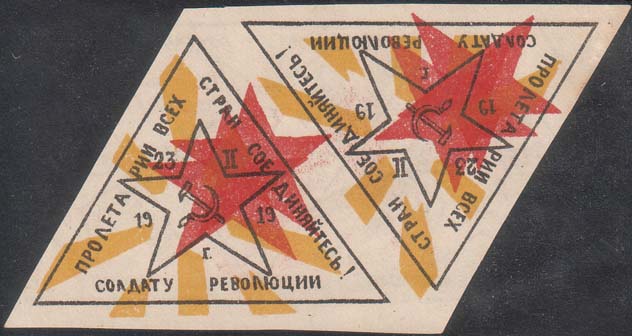 1919 г. 23.02.1919 г.  Виньетка в форме треугольника разм. рамки 61 х 45 мм. Трехцветная печать на бумаге различных цветов. В центре красная звезда с серпом и молотом. Между лучами звезды дата: «23.II.1919 г». По периметру рамки текст: «Пролетарии всех стран соединяйтесь! Солдату революции».