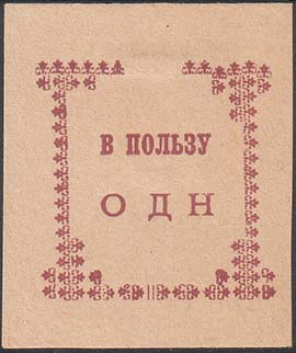 1932 г. 07.-08.11.1932 г.  Разм. 43 х 53 мм. Одноцветная печать на желтоватой бумаге. В центре в декоративной рамке 31 х 37 мм текст в две строки: «В пользу ОДН».