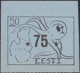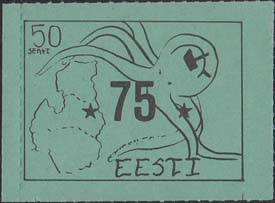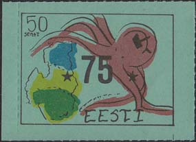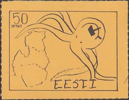 1980(?) г. Разм. по перфорации ≈ 44 х 33 мм. Одноцветная и многоцветная печать на бумаге различных цветов. Линейная просечка. С клеем. В прямоугольной рамке разм. 37 х 28 мм примитивный рисунок. Спрут с серпом и молотом на голове протягивает щупальца к схематической карте балтийских стран. В левом верхнем углу номинал. Справа внизу текст на английском языке: "Эстония".