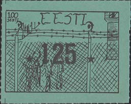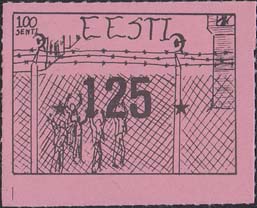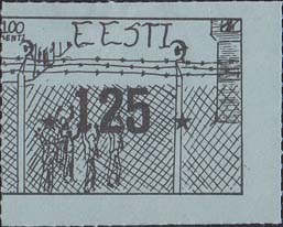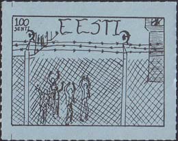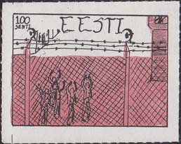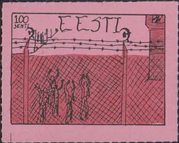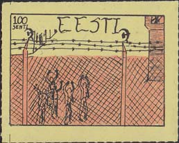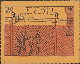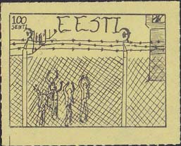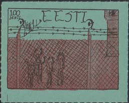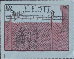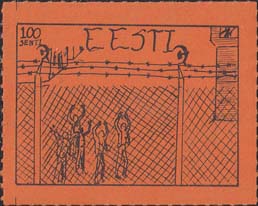 1980(?) г.   Разм. по перфорации ≈ 44 х 34 мм. Одноцветная и многоцветная печать на бумаге различных цветов. Линейная просечка. С клеем. В прямоугольной рамке разм. 37 х 27 мм примитивный рисунок. Группа людей за колючей проволокой. Сверху номинал и текст на английском языке: "Эстония".
