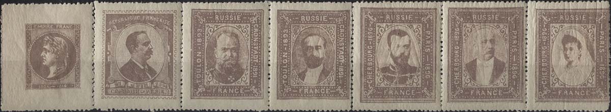 1898 г. Разм. по перфорации 27 х 36 мм. Одноцветная печать на белой бумаге. Зубц. 13 1/4. С клеем. В центре различные портреты.