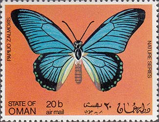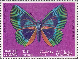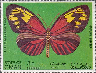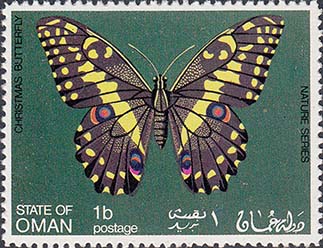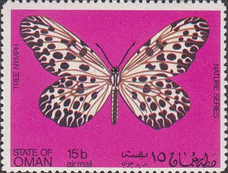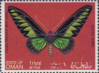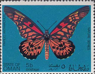 1970(?) г. Разм. рис. 51 х 38 мм. Многоцветная печать на белой глянцевой бумаге. Зцбц. 11. С клеем. В центре на сплошном фоне бабочки различных видов. Тексты на английском и арабском языках.