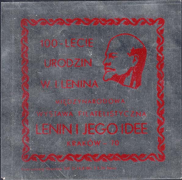 1970 г. Одноцветная печать на серебристой фольгированной бумаге. В правом верхнем углу барельеф В.И. Ленина. Текст на польском языке "100 - летие со дня рождения В.И. Ленина. международная филателистическая выставка "Ленин и его идеи". Краков 1970". Внизу под рамкой выходные данные на польском языке.