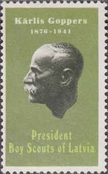 1970 г. Разм. рис. 22 х 38 мм. Трехцветная печать на белой бумаге. Зубц. 12 1/2. С клеем. В центре портрет генерала Гоппера в профиль. Сверху текст на латышском языке: «Карл Гоппер 1878-1941». Внизу тест в две строки: «Глава бойскаутов Латвии».