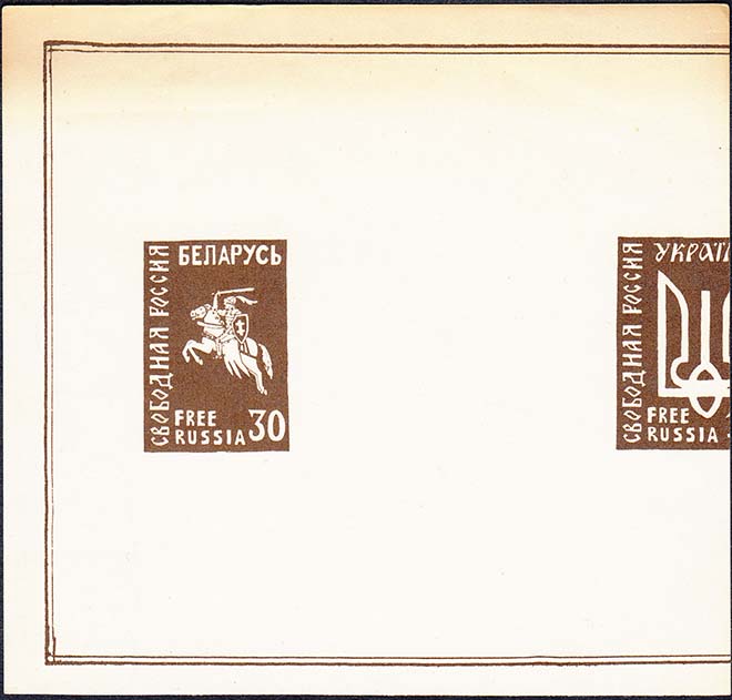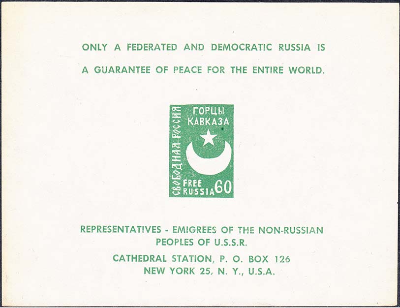 1958 г. 22.11.1958 г. Листок разм. 137 х 106 мм. Двухцветная печать на простой белой бумаге и на бумаге с ВЗ. В центре в двойной прямоугольной рамке разм. 125 х 95 мм три марки с гербом Белоруссии, Украины и полумесяцем со звездой. Тексты на английском языке.