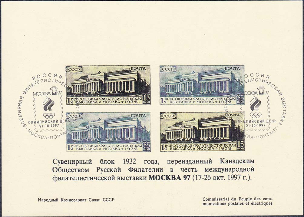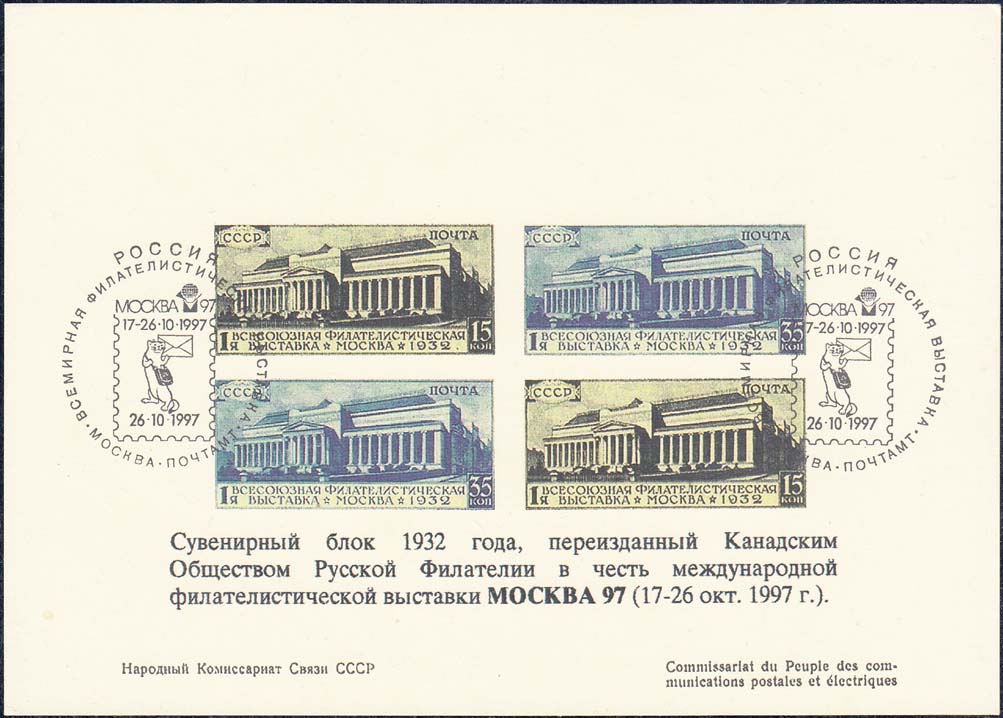 1997 г.   Листок разм. 169 х 120 мм. Многоцветная двухсторонняя печать на плотной белой бумаге. На лицевой стороне четыре почтовых марки СССР, посвященных 1-й всесоюзной филателистической выставке 1932 года. На полях листка внизу текст в три строки: "Сувенирный блок 1932 года, переизданный Канадским Обществом Русской Филателии в честь международной филателистической выставки Москва 97 (17-26 окт. 1997 г.)". Внизу текст мелким шрифтом на русском и английском языках: "Народный Комиссариат Связи СССР". На оборотной стороне в центре текст в семь строк на английском языке. Внизу под чертой текст в две строки: "Печатник: Андрей Александрович Бороденко".
