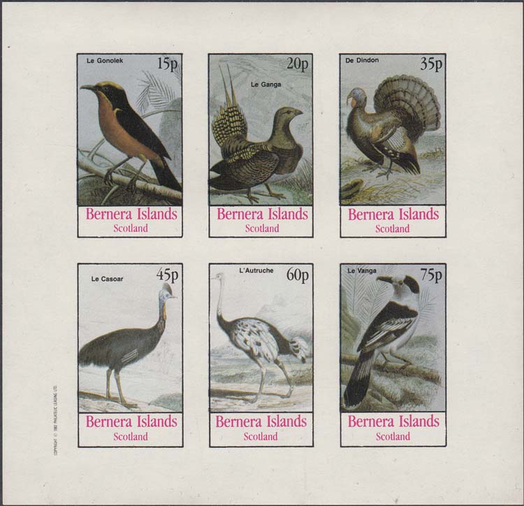 1982 г. Разм. 25 х 45 мм. Многоцветная печать на белой глянцевой бумаге. Зубц. лин. 10 3/4 и Б.З. С клеем. В центре в прямоугольной рамке птицы различных видов и пояснительный текст на английском языке. В правом верхнем углу номинал. Внизу текст на английском языке: "Barnera Islands Scotland".