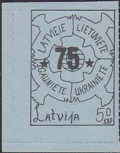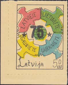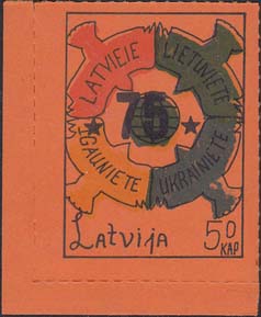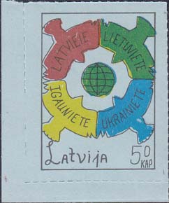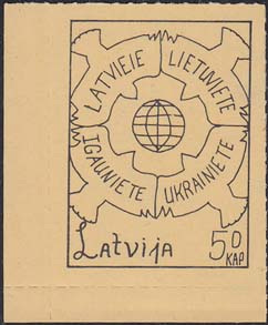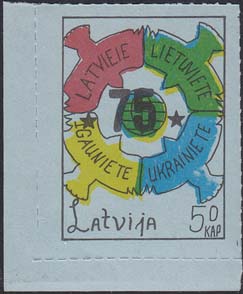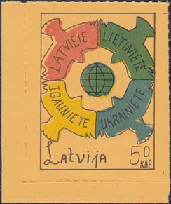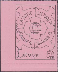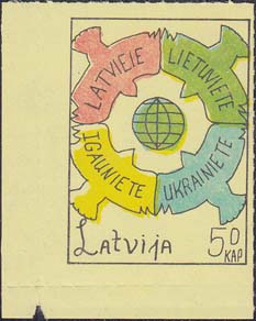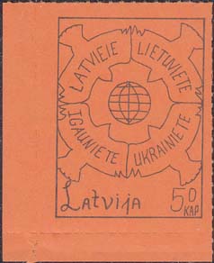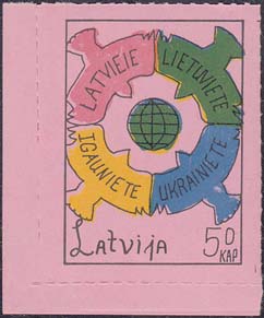 1980(?) г. Разм. по перфорации ≈ 34 х 46 мм. Одноцветная и многоцветная печать на бумаге различных цветов. Линейная просечка. С клеем. В прямоугольной рамке разм. 28 х 37 мм примитивный рисунок. В центре изображение земного шара. о окружности четыре голубя с текстами на латышском(?) языке: "Латвия, Литва, Эстония, Украина". Внизу текст: "Латвия" на английском языке и номинал.