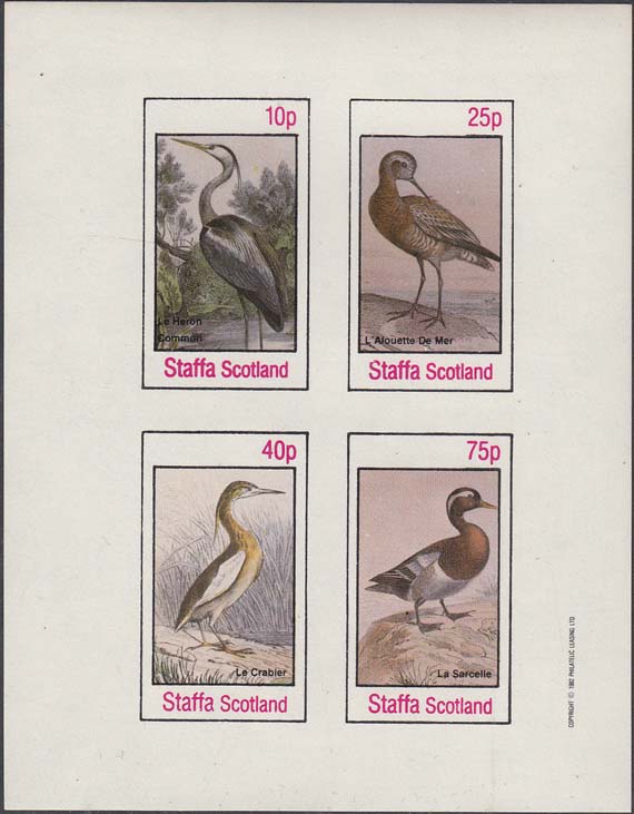 1982 г. Разм. рамки 26 х 45 мм. Многоцветная печать на белой глянцевой бумаге. Зубц. лин. 11 и Б.З. В центре изображение птиц разных видов и пояснительный текст на английском языке. Сверху справа номинал. Внизу текст на английском языке: "Staffa scotland".