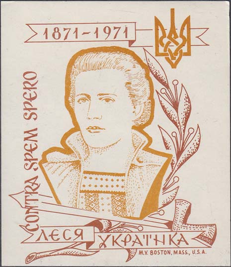 1971 г. Разм. 78 х 89 мм. Двухцветная печать на белой глянцевой бумаге. С клеем. В центре бюст Леси Украинки. Тексты на украинском и латыни. Сверху на ленте даты: "1871 - 1971".