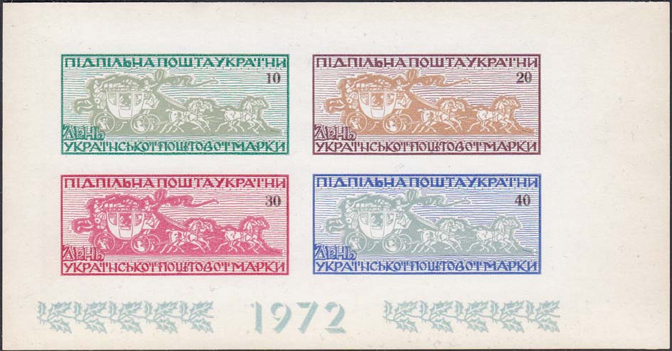 1972 г. Разм. рамки 54 х 24 мм. Многоцветная печать на белой мелованной бумаге. Зубц. 12 и БЗ. С клеем. В прямоугольной рамке почтовая карета в движении. Сверху текст на украинском языке: "Подпольная почта Украины" и номинал. Внизу текст на украинском языке: "День украинской почтовой марки".