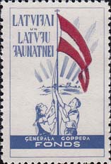 1964 г. Разм. 23 х 36 мм. Двухцветная печать на белой бумаге. Зубц. 12 1/2. С клеем. В прямоугоьной рамке в центре юноша и девушка поднимают флаг Латвии. Название организации на латышском или английском языках.