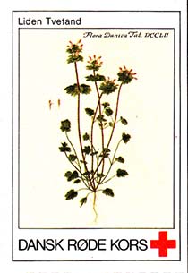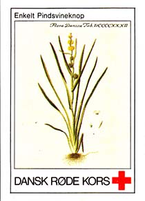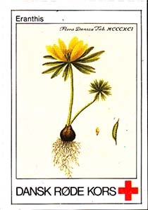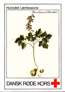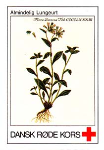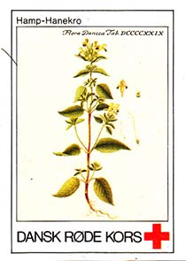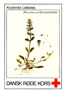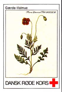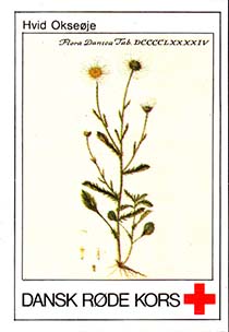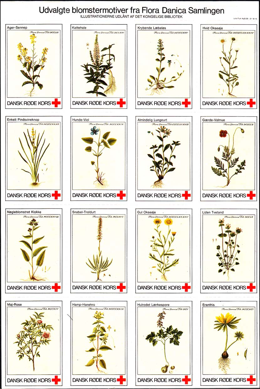 1980(?) г. Разм. 31 х 46 мм. Многоцветная печать на белой бумаге. Линейная просечка. С клеем. В центре растения различных видов. Внизу знак красного креста и текст на датском языке: "Датский Красный Крест".