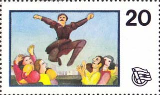1978(?) г. Разм. по перфорации 54 х 32 мм. Многоцветная печать на белой бумаге. Зубц. 13. С клеем. В в прямоугольной рамке различные рисунки. Справа номинал (на марках) и эмблема общества.