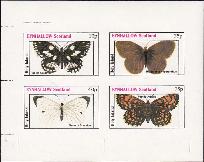 1982 г. Разм. раки 45 х 26 мм. Многоцветная печать на белой глянцевой бумаге. Зубц. 11. С клеем. В центре бабочки различных видов, номинал и тексты на английском языке.
