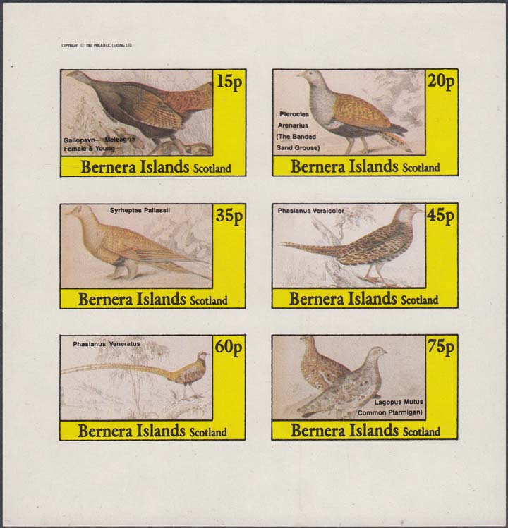 1982 г. Разм. 45 х 25 мм. Многоцветная печать на белой глянцевой бумаге. Зубц. лин. 10 3/4 и Б.З. С клеем. В центре в прямоугольной рамке птицы различных видов и пояснительный текст на английском языке. В правом верхнем углу номинал. Внизу текст на английском языке: "Barnera Islands Scotland".
