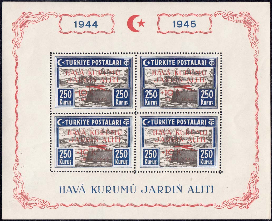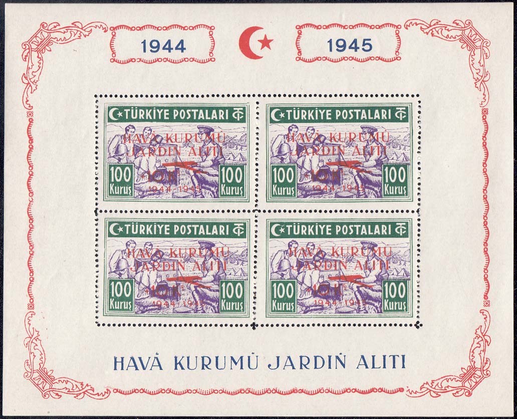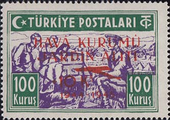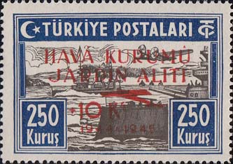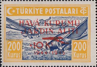 1945 г. Красная надпечатка текста на турецком языке, номинала надбавки, контура самолета и дат: "1944 - 1945" на марках предыдущего выпуска.