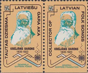 1985 г. Разм. по перфорации 26 х 41 мм. Трехцветная печать на белой бумаге. Зубц. 10 3/4. С клеем. На сплошном фоне в декоративной рамке портрет К. Барона. Внизу подпись к портрету на латышском или английском языке. По периметру текст на латышском или английском языках. Внизу название организации на латышском или английском языках.