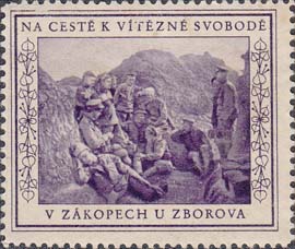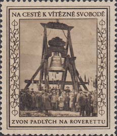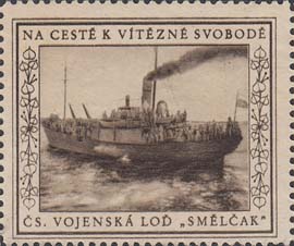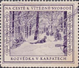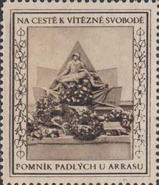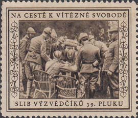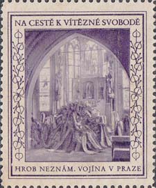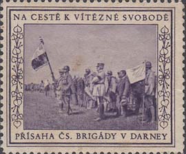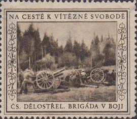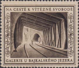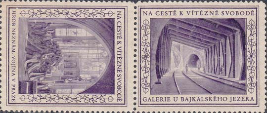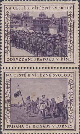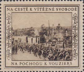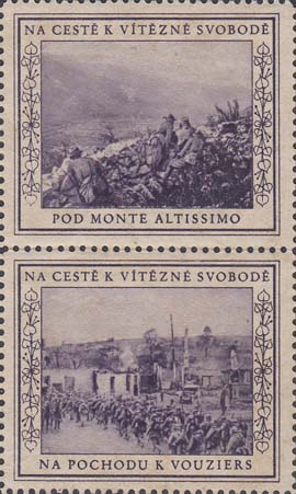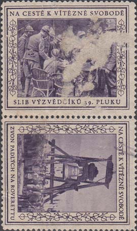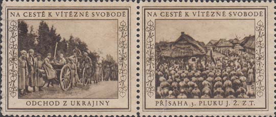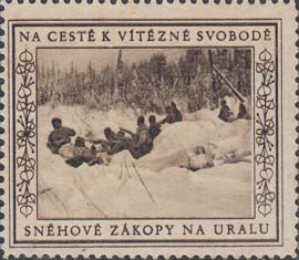 1927(?) г. Разм. рамки 42 х 35 мм или 35 х 42 мм. Одноцветная печать на желтоватой бумаге. Зубц. лин. 10 3/4 х 11 1/2. С клеем. В двойной прямоугольной рамке в центре репродукции различных фотографий из жизни чехословацкого корпуса. Сверху текст на чешском языке: "На пути с свободе". Внизу подписи к фотографиям на чешском языке.