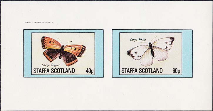 1982 г. Разм. рамки 46 х 28 мм. Многоцветная печать на белой глянцевой бумаге. Зубц. 11. и Б.З. С клеем. В центре бабочки различных видов, номинал и тексты на английском языке.