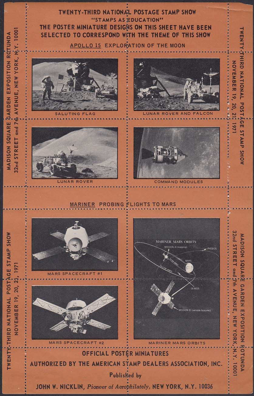 1971 г. Разм. по перфорации 52 х 36 мм. Двухцветная печать на белой бумаге. Зубц. 12 1/2. С клеем. В центре различные рисунки, посвященные американским программам Аполлон и Маринер.