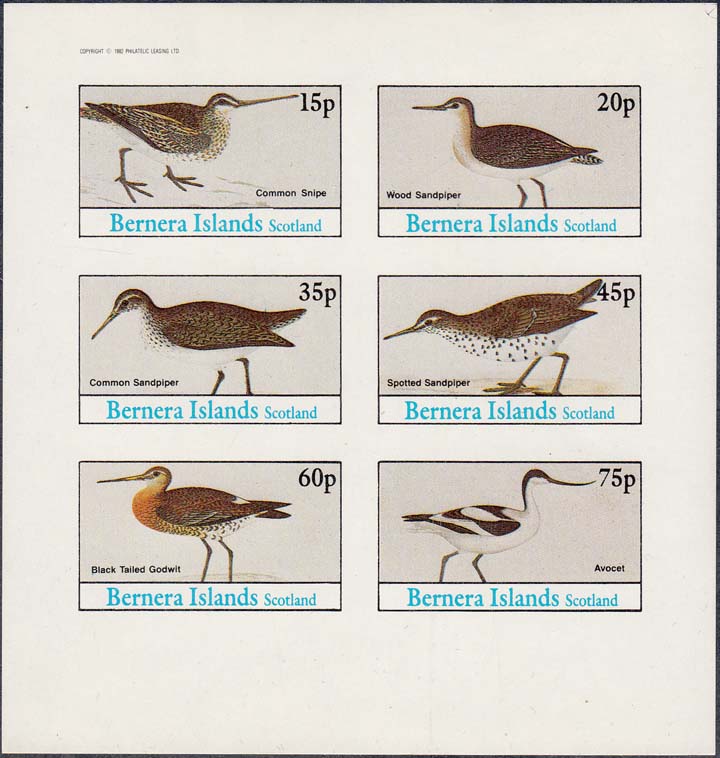 1982 г. Разм. 44 х 25 мм. Многоцветная печать на белой глянцевой бумаге. Зубц. лин. 10 3/4 и Б.З. С клеем. В центре в прямоугольной рамке птицы различных видов и пояснительный текст на английском языке. В правом верхнем углу номинал. Внизу текст на английском языке: "Barnera Islands Scotland".