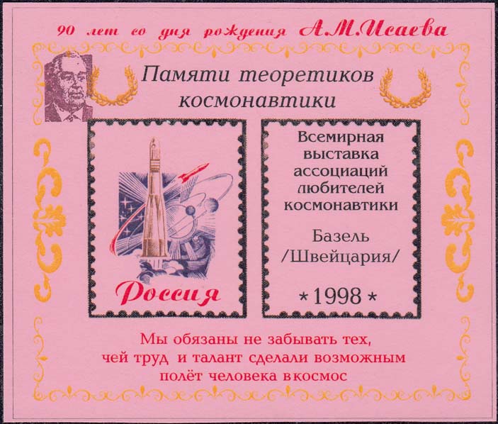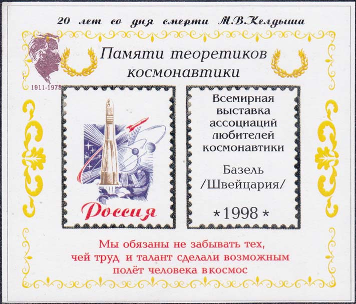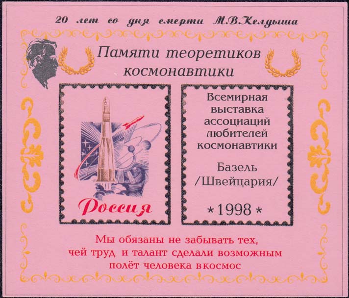 1998 г. Разм. рамки 117 х 99 мм. Многоцветная печать на бумаге различных цветов и толщины. В прямоугольной декоративной рамке в центре стилизованное изображение двух виньеток. На одной из них стилизованное изображение планет и ракет. На другой текст в восемь строк: "Всемирная выставка ассоциаций любителей космонавтики Базель /Швейцария/. 1998". Сверху портреты советских ученых - теоретиков космонавтики и текст в две строки: "Памяти теоретиков космонавтики". Выше между рамками памятный текст. Внизу текст в три строки: "Мы обязаны не забывать тех, чей труд и талант сделали возможным полет человека в космос."