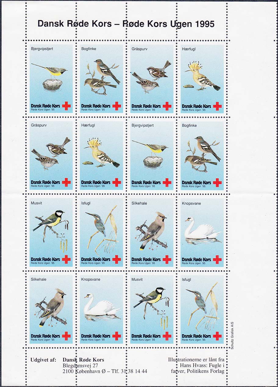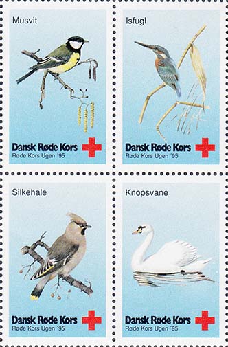 1995 г. Разм. рис. 24 х 38 мм. Многоцветная печать на белой бумаге. Зубц. 13 1/2. С клеем. В центре различные птицы и пояснительный текст на датском языке. Внизу знак Красного креста и текст в две строки на датском языке: "Датский Красный Крест. Неделя Красного креста 95".