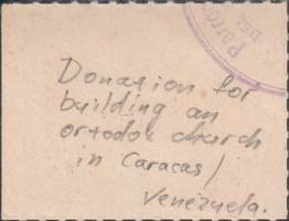 1930(?) г. Разм. рамки 34 х 29 мм. Одноцветная печать на белой бумаге. Линейная просечка. В прямо-угольной рамке в центре православная церковь и пальмы. Сверху и снизу текст на русском и испанском языках: «На построение православ[ного]. Храма в Каракасе». На обороте фрагмент синего оттиска круглой контрольной печати.