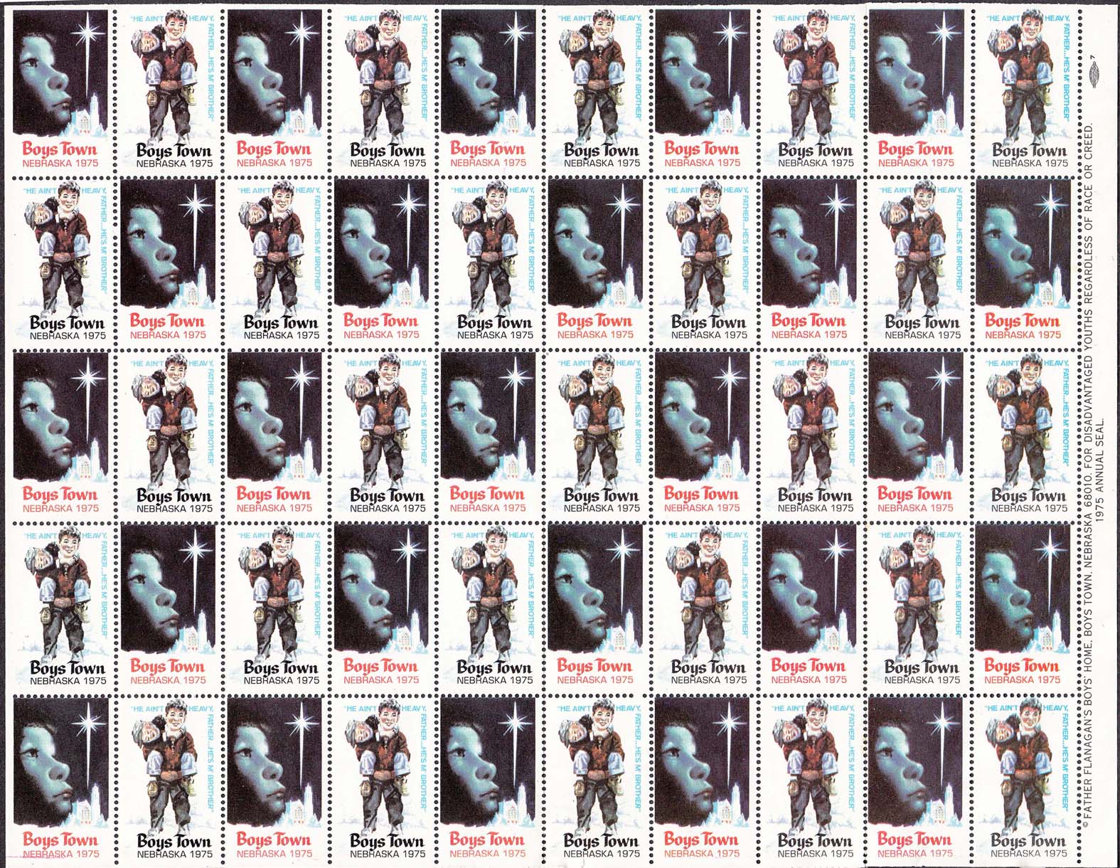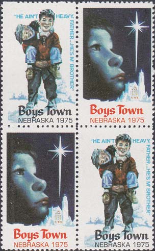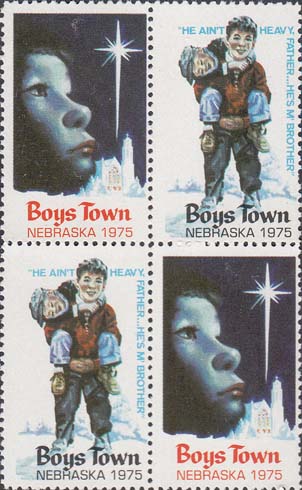 1975 г.   Разм. 26 х 43 мм. Многоцветная печать на белой мелованной бумаге. Зубц. Лин. 12 1/2. С клеем. В центре различные рисунки. Текст на английском языке: "Город Мальчиков Небраска 1975".