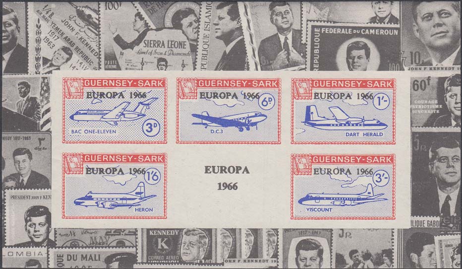1966 г. Блок разм. 158 х 92 мм. В центре блока пять марок с изображением различных самолетов. На полях блока репродукции марок с портретами Д.Ф. Кеннеди.
