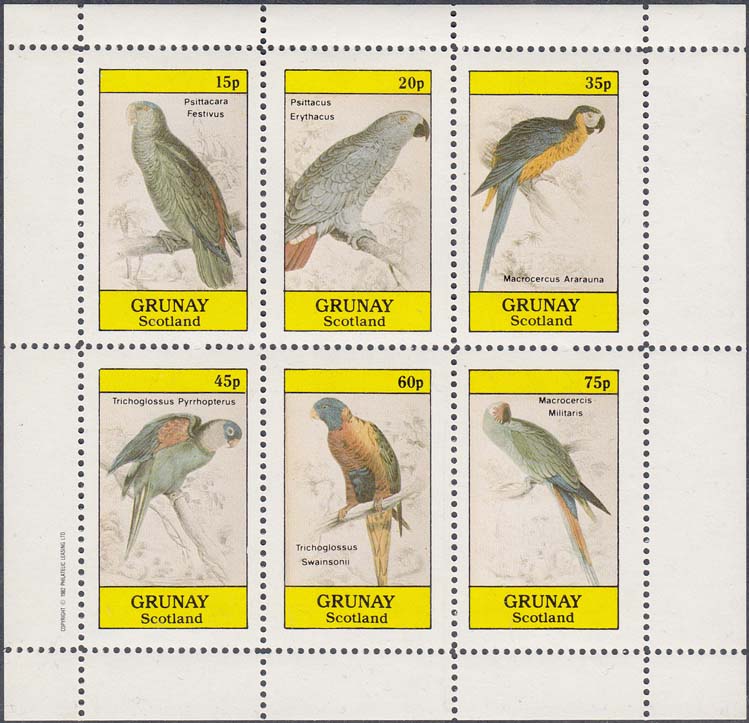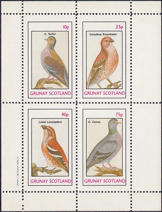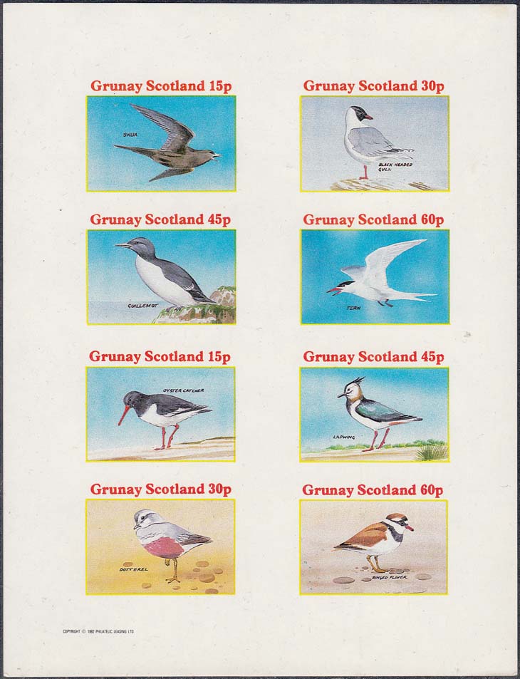 1982 г. Разм. рамки 23 х 34 мм. Многоцветная печать на белой глянцевой бумаге. Зубц. лин. 10 3/4 и Б.З. С клеем. В центре в прямоугольной рамке птицы различных видов и пояснительный текст на английском языке. В правом верхнем углу номинал. Внизу текст на английском языке: "Grunay Scotland".