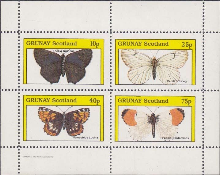 1982 г. Разм. рис. 45 х 25 мм. Многоцветная печать на белой глянцевой бумаге. Зубц. 10 3/4 и Б.З. С клеем. В центре изображение бабочек различных видов и пояснительный текст на английском языке. Сверху текст на английском языке: "Gruney Scotland" и номинал.