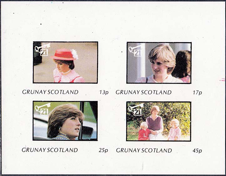 1980(?) г. Разм. рис. 35 х 22 мм. Многоцветная печать на белой глянцевой бумаге. В центе различные фотографии Принцессы Дианы. Внизу текст на английском языке: "Grunay Scotland" и номинал.
