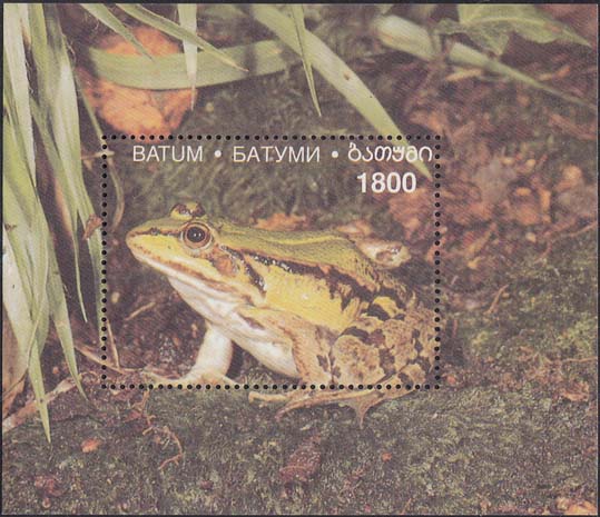 2000(?) г. Блок разм. 91 х 78 мм. Многоцветная печать на белой бумаге. Зубц. 13 3/4. С клеем. В центре лягушка на фоне природы. Сверху номинал и название территории на английском, русском и грузинском языках. На полях блока продолжение рисунка.