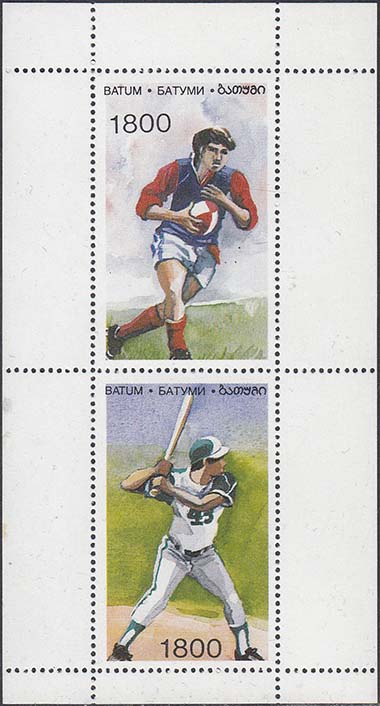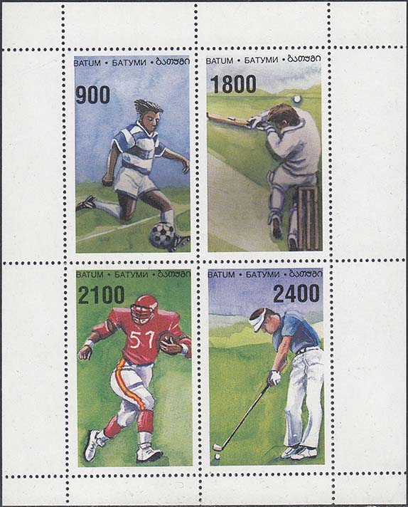 2000(?) г. Разм. рис. 46 х 27 мм. Многоцветная печать на белой глянцевой бумаге. Зубц. греб. 14 1/4. С клеем. В центре различные виды спорта. Сверху номинал и текст на английском, русском и грузинском языках: "Батуми".